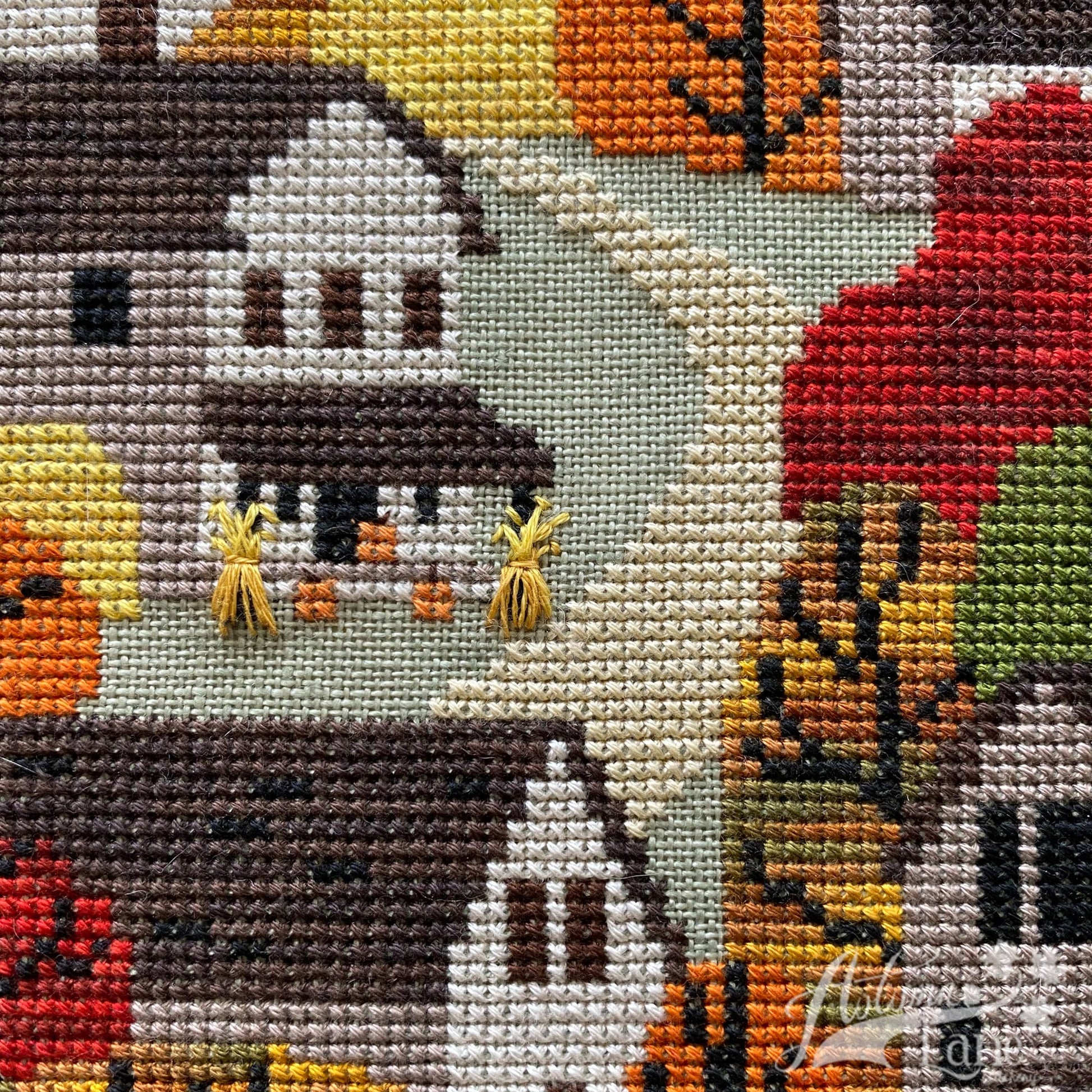 Snuggled up along the mountainside, this little cozy town is enjoying the air getting crisper, and the vibrant colors of Fall sweep over the forest. Autumn is in the air! This is a fairly easy cross stitch, with mostly full cross stitches and some backstitches. With this pattern, there are some variegated threads from Gloriana silk floss, and Weeks Dye Works, but we give the substitute in DMC to make it more readily accessible for everyone.