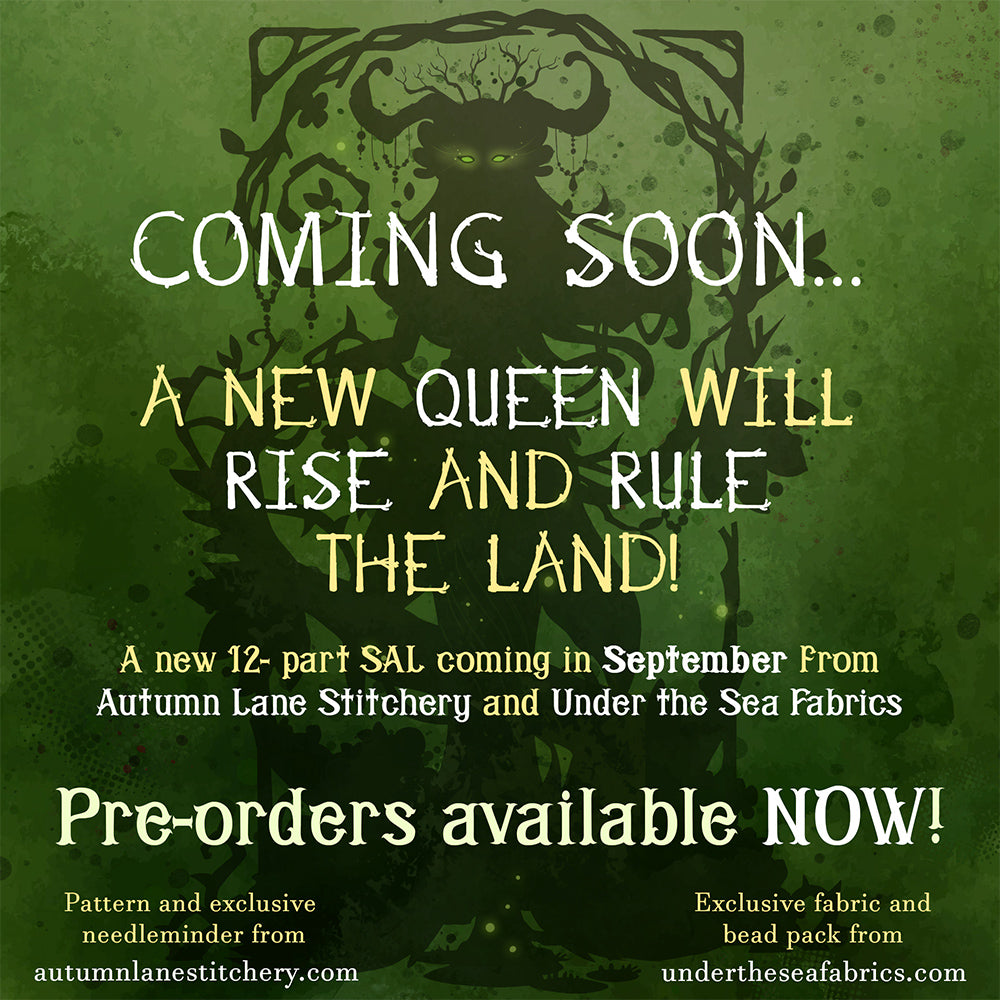 If you wish, while you wait for the pattern to be up you can purchase the exclusive fabric(s) and bead pack for the SAL from https://undertheseafabrics.com/product-category/dark-queen-2022/