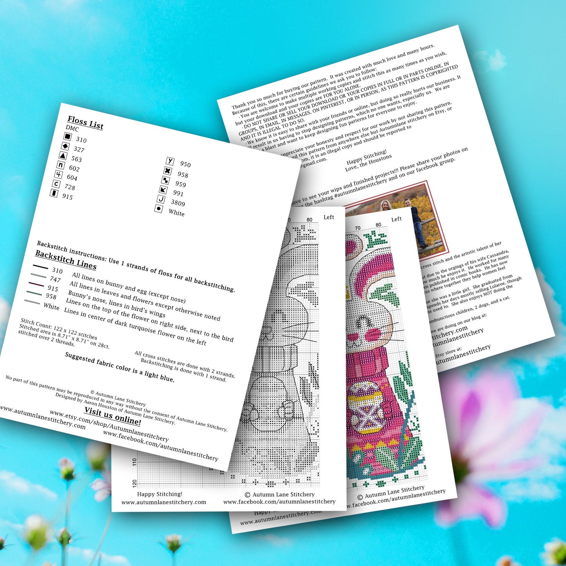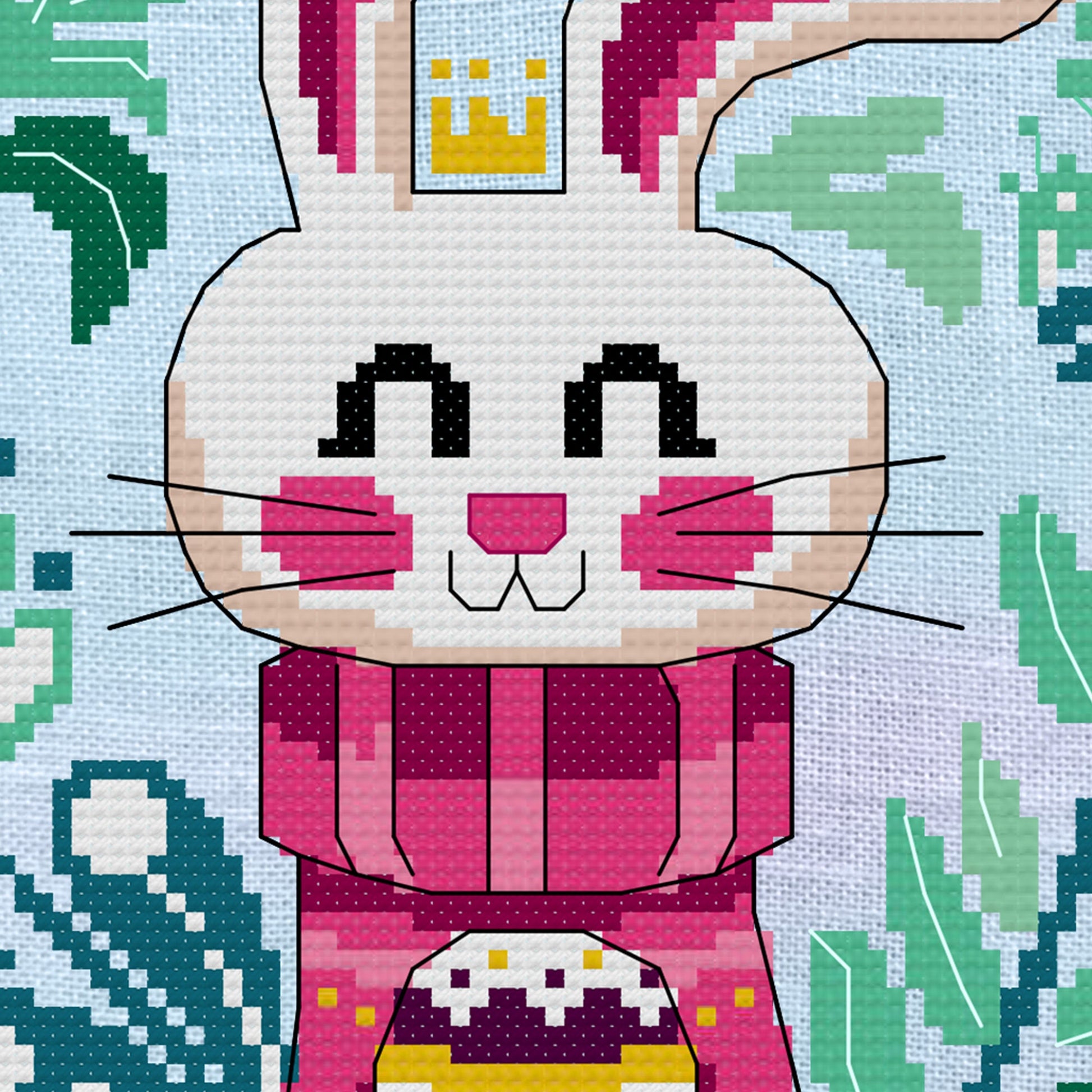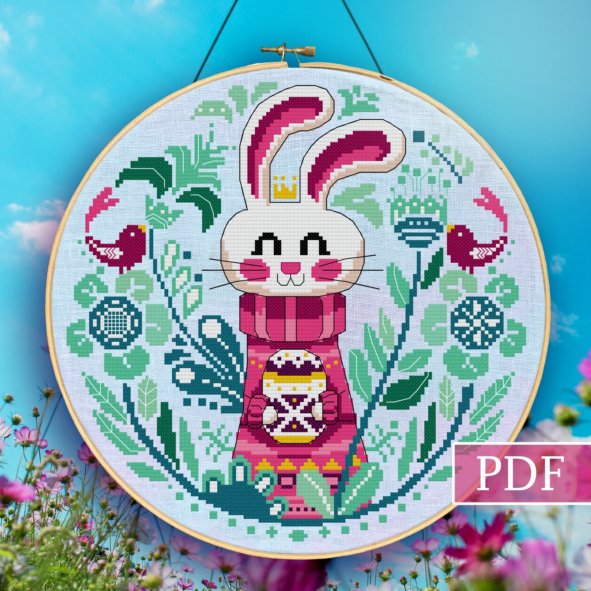 In this Easter-inspired cross stitch design, you get the cutest little Easter bunny wearing a sweater! He is surrounded by a folk art floral design that uses bright spring colors!