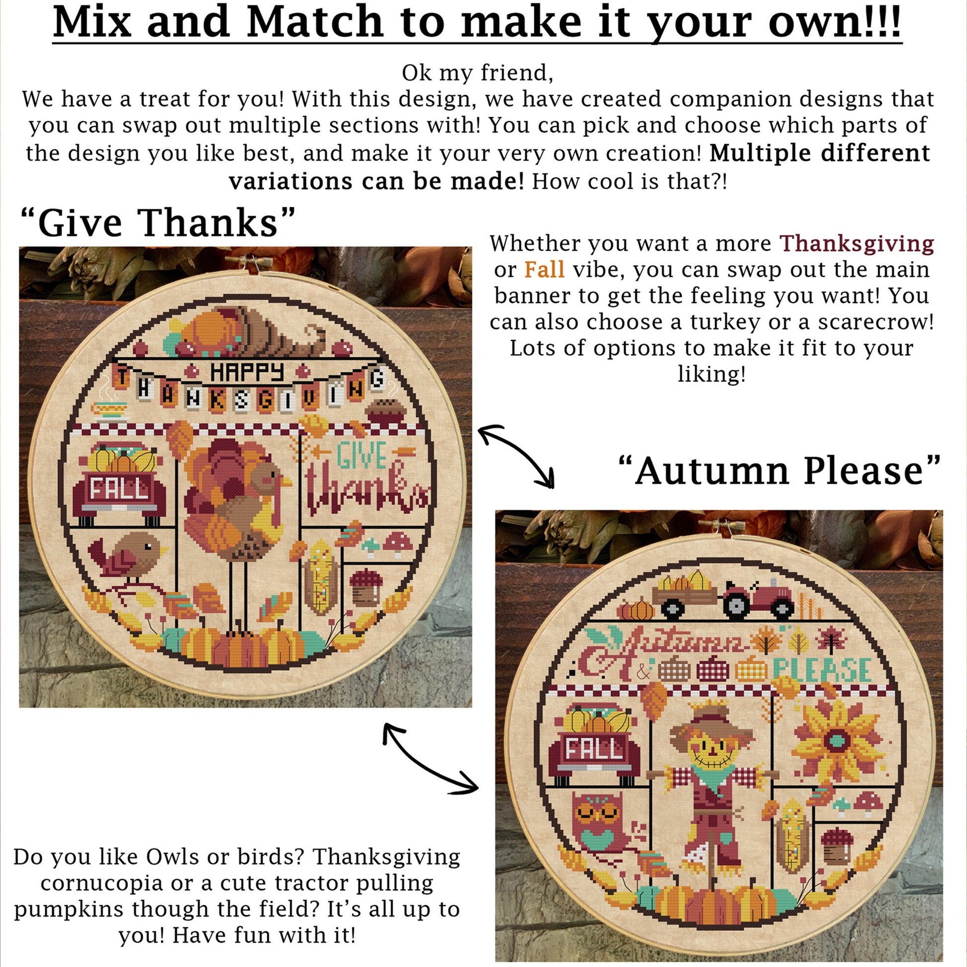 This pattern is part of a set. With its companion, "Autumn Leaves and Pumpkins Please" you can mix and match many sections to make it your own. You can see an example in the photos for this listing.
