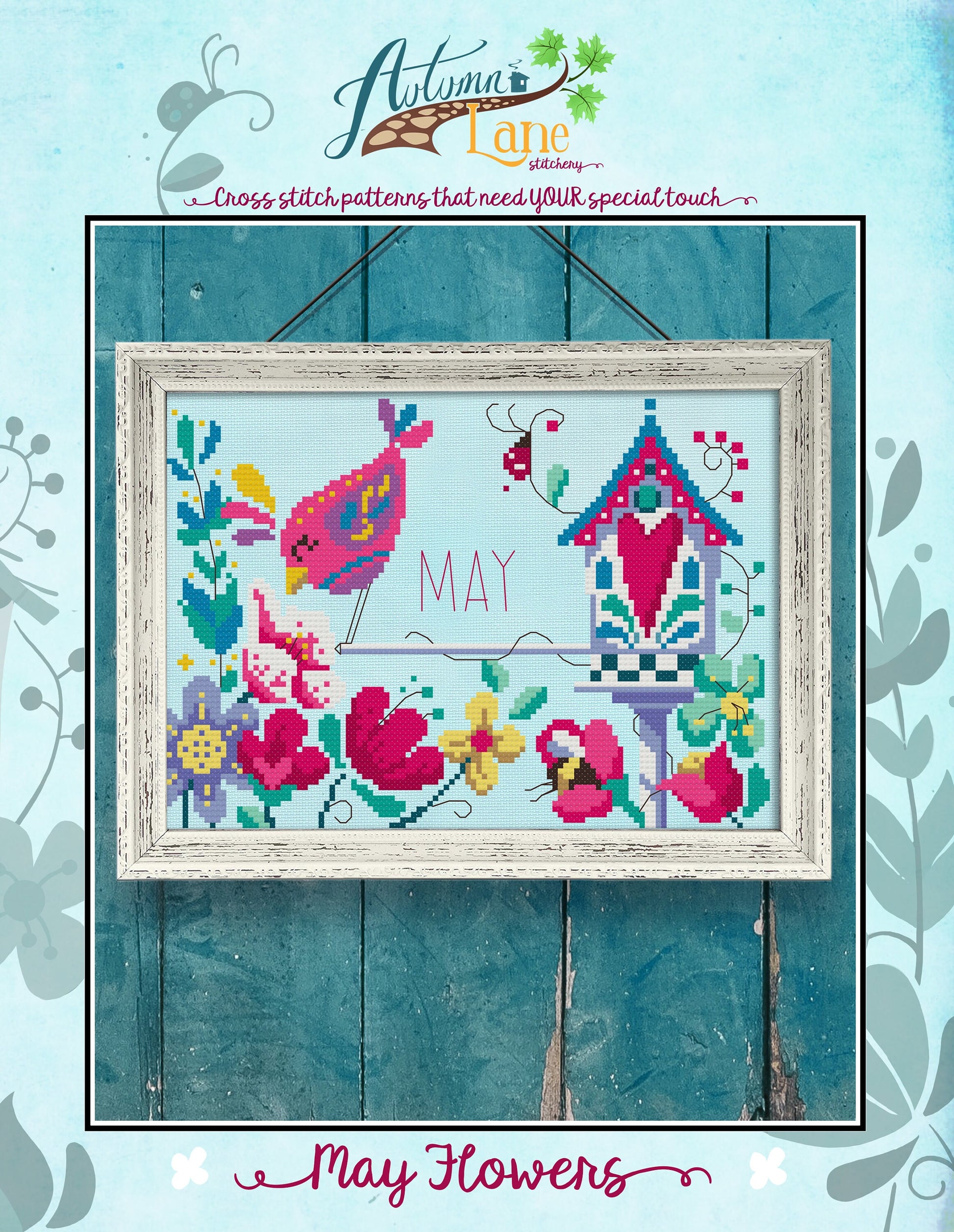 It's May! The flowers are blooming and the animals are out enjoying the beautiful weather! The birds are chirping, the bees buzzing, and the garden is blossoming to life in this super cute folk art inspired cross stitch pattern.