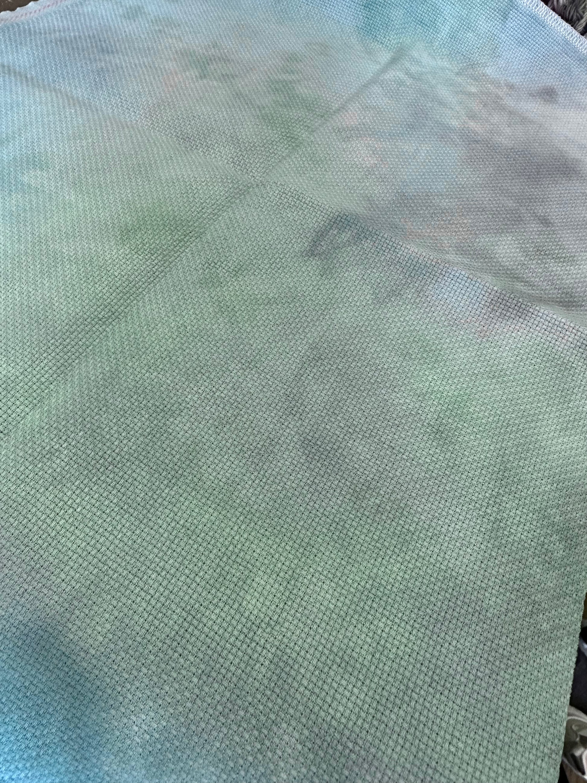 *****Fabric is a mixture of blues and greens (the blues blend and give off a purple-ish hue in some places). In some pieces the green is dominant. In some pieces the blue is dominant. The Aida seems to have more patchy parts of green and not be as “blended”.